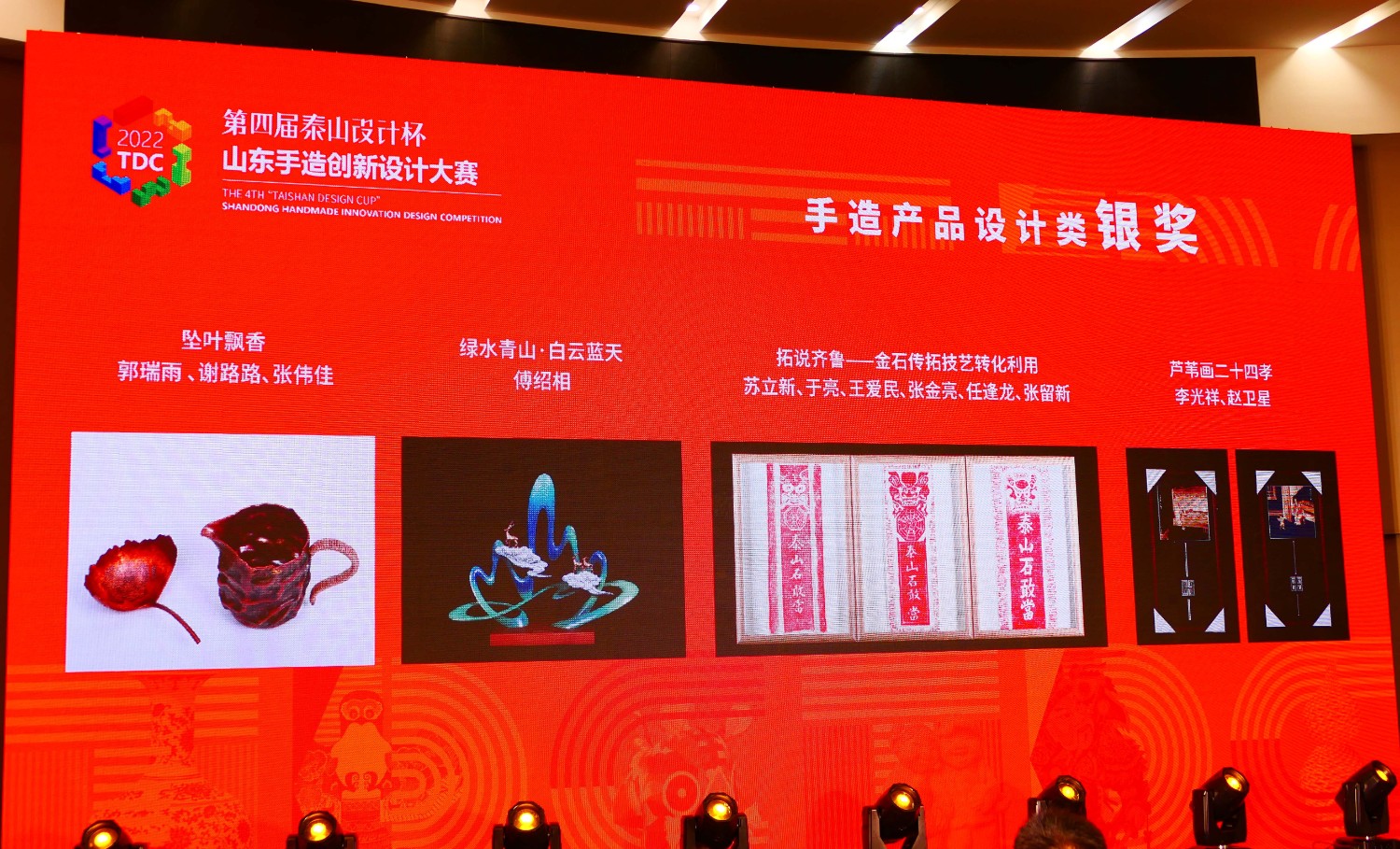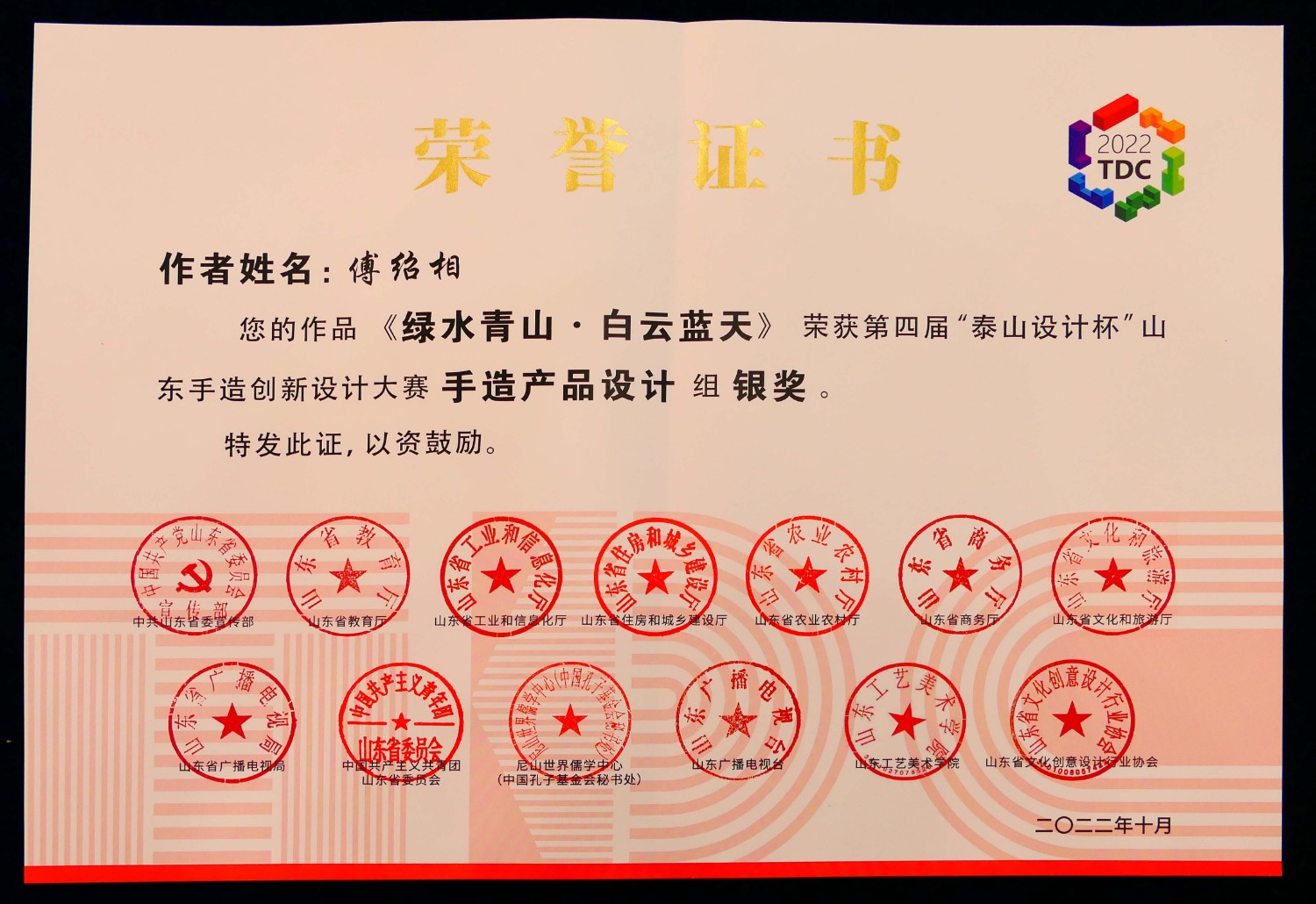 2022年9月16日,第四屆“泰山設(shè)計(jì)杯”山東手造創(chuàng)新設(shè)計(jì)大賽頒獎典禮,在山東手造展示體驗(yàn)中心隆重舉行。傅紹相作品《綠水青山?白云藍(lán)天》榮獲第四屆“泰山設(shè)計(jì)杯”山東手造創(chuàng)新設(shè)計(jì)大賽手造產(chǎn)品設(shè)計(jì)組“銀獎”。