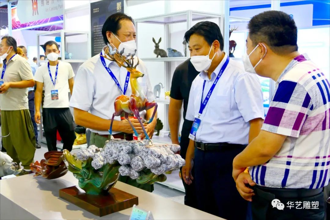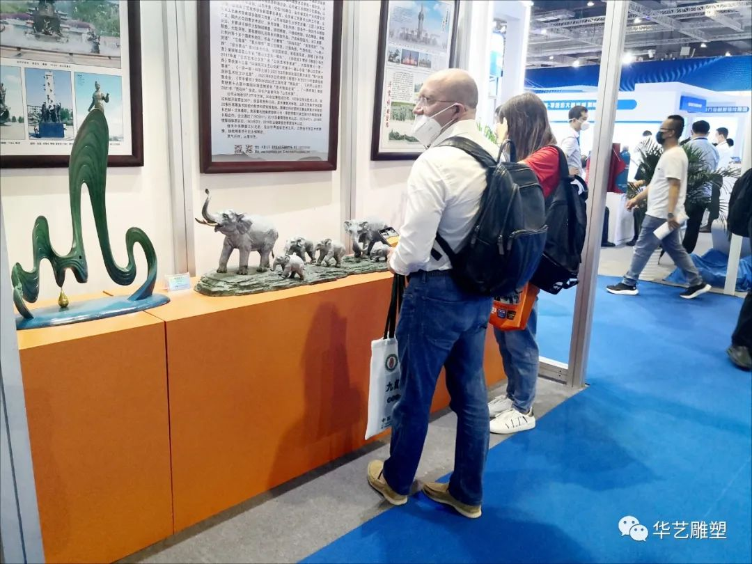 2022年9月19日第二十屆中國國際鑄造博覽會,國外嘉賓參觀華藝雕塑《山青水韻》《回家》等雕塑作品
