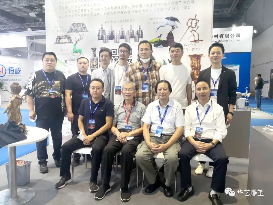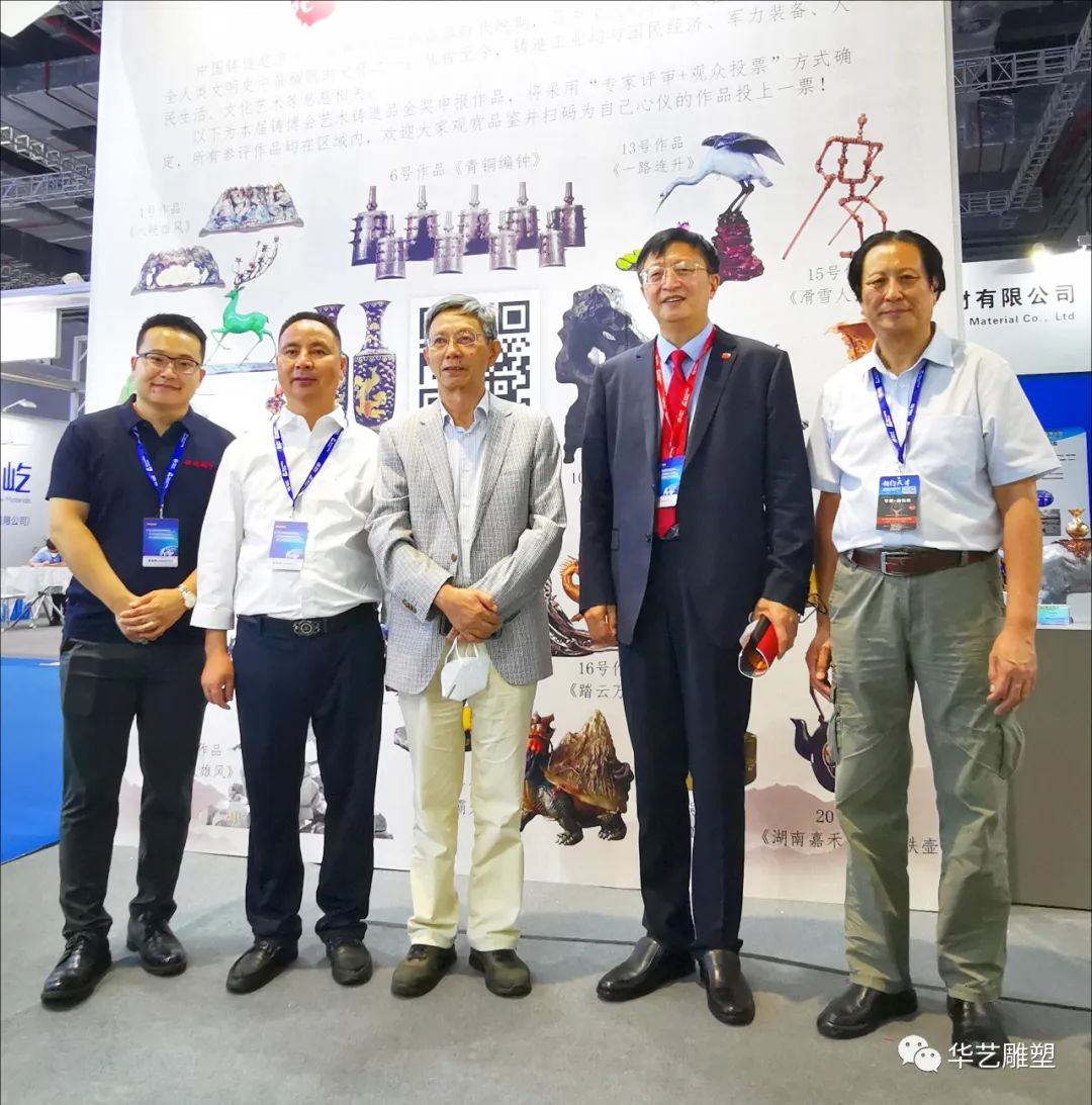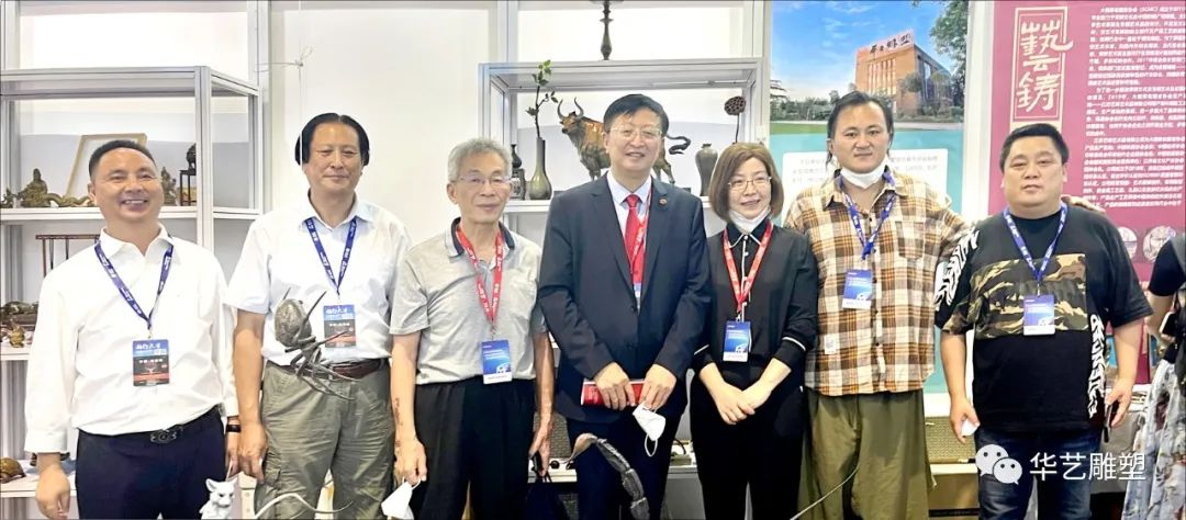 中國機械工業(yè)聯(lián)合會副會長、中國鑄造協(xié)會會長張立波,藝鑄分會特聘專家詹紹思,中國鑄造協(xié)會總工程師、藝術(shù)鑄造分會秘書長袁亞娟與參展企業(yè)代表合影