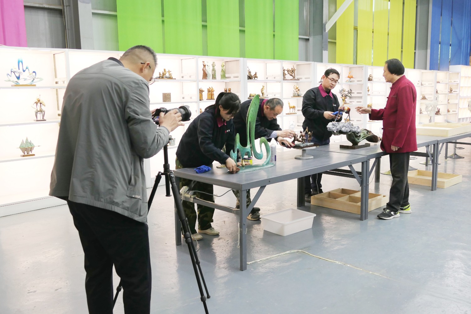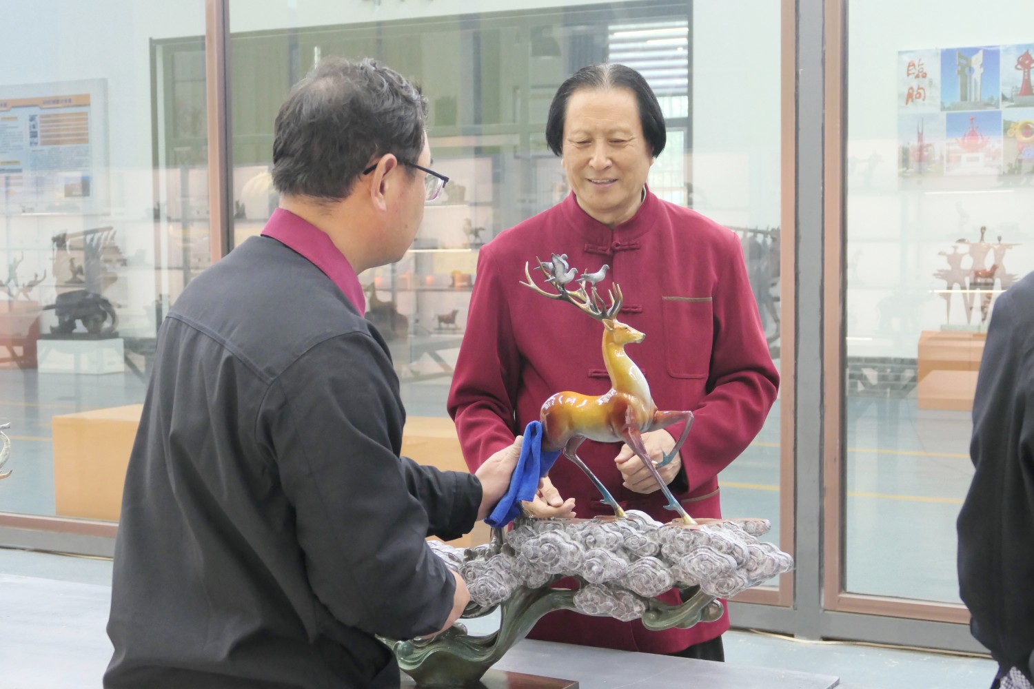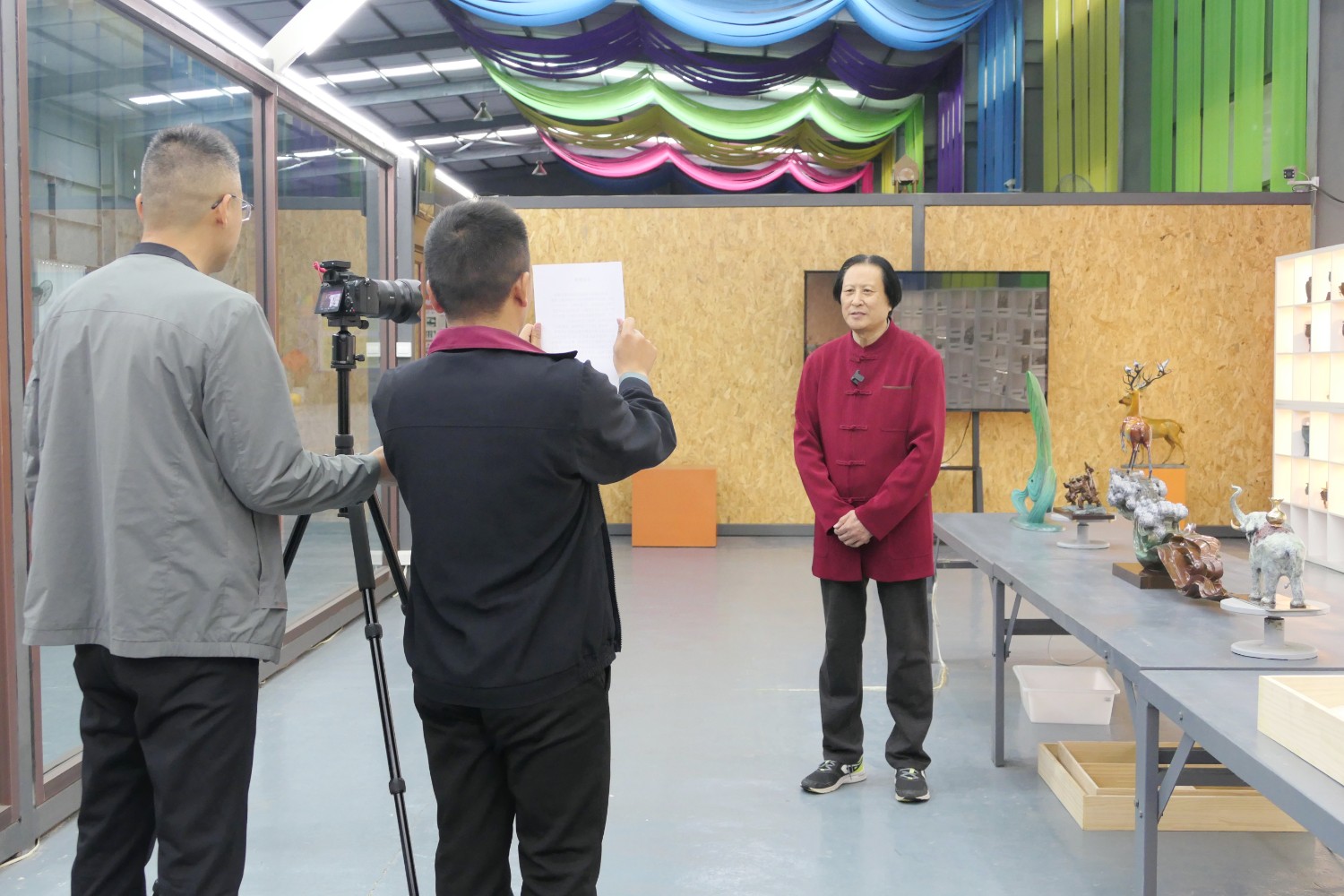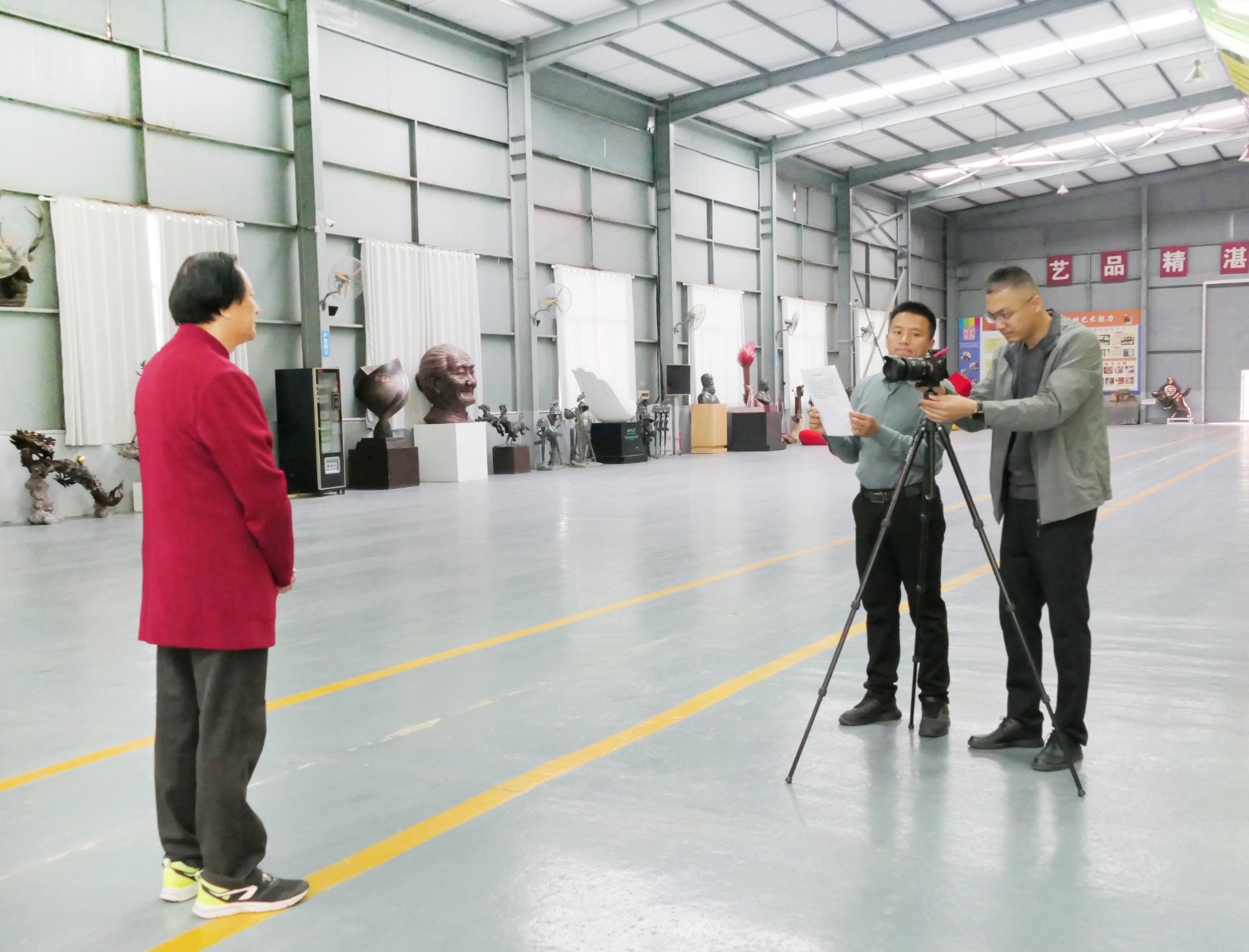 2023年4月4日,臨朐縣電視臺(tái)記者蘇凱來(lái)華藝拍攝選送“第40屆濰坊國(guó)際風(fēng)箏會(huì)”展出的四件青銅作品《一路祥瑞》《放飛》《山青水韻》《太平吉象》,傅紹相參加采訪視頻。
