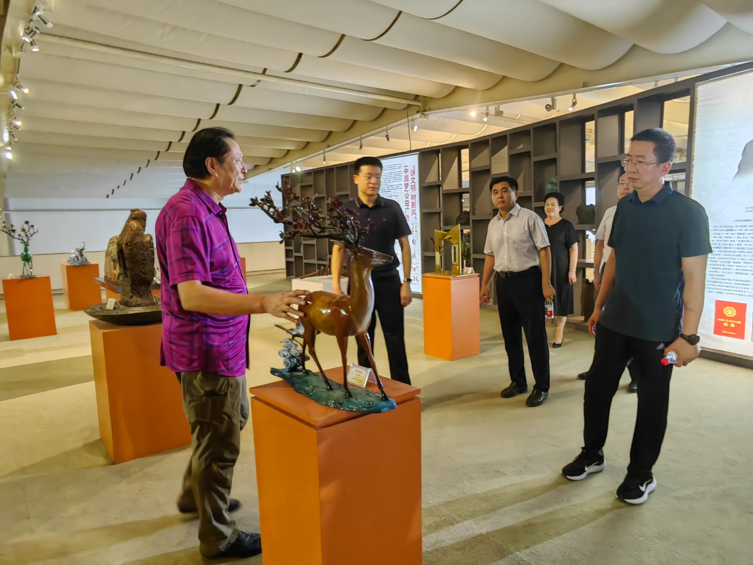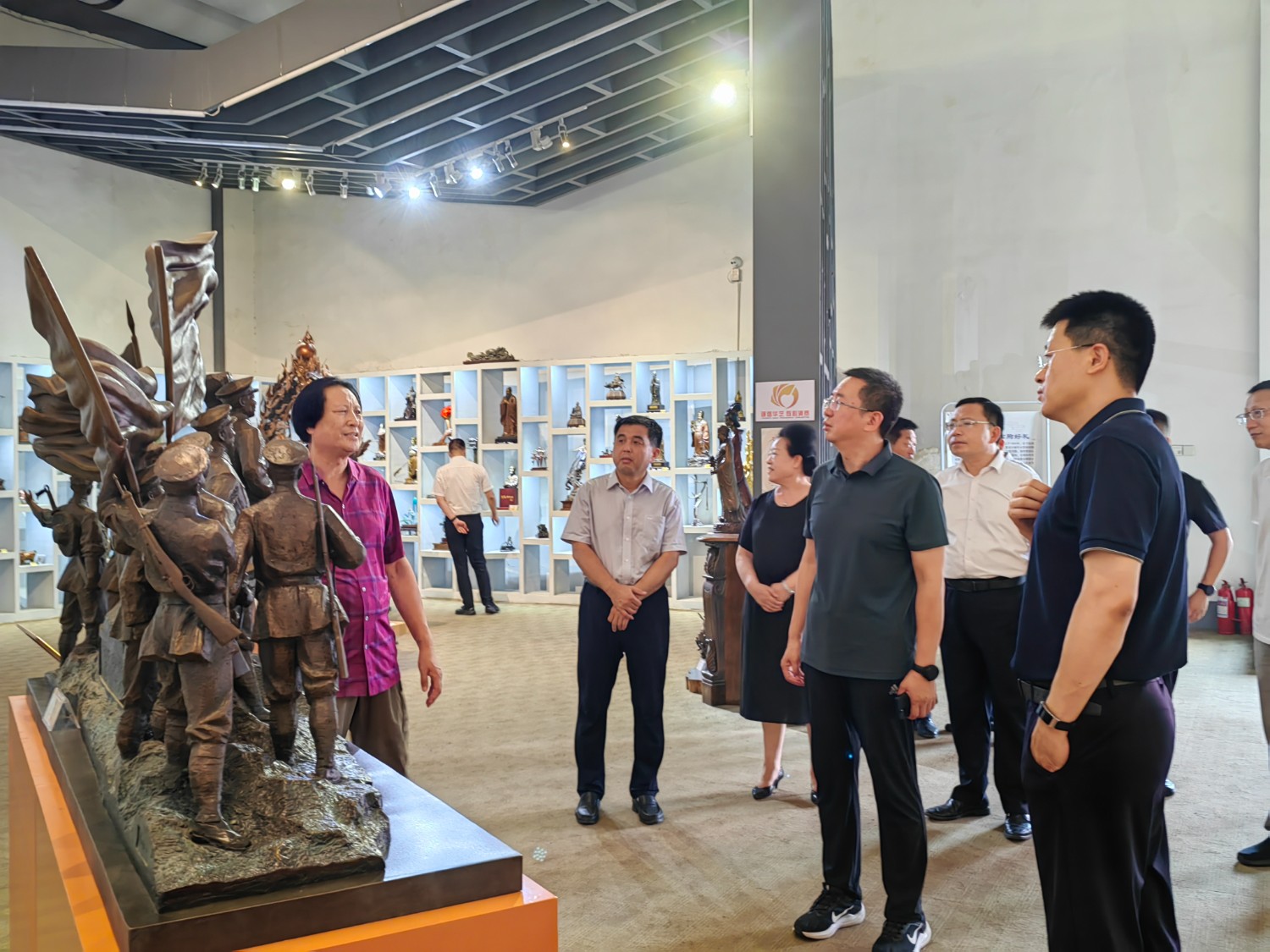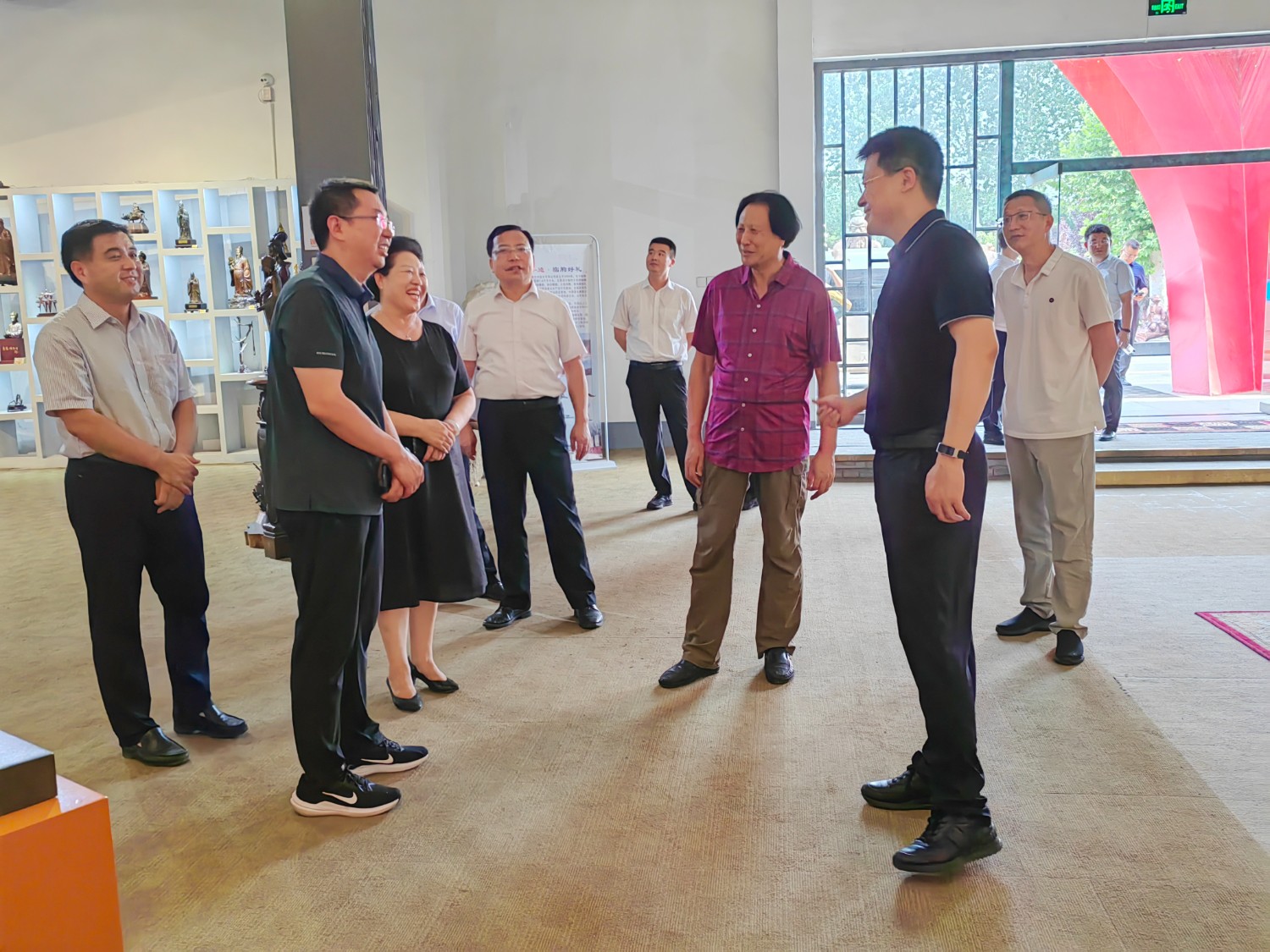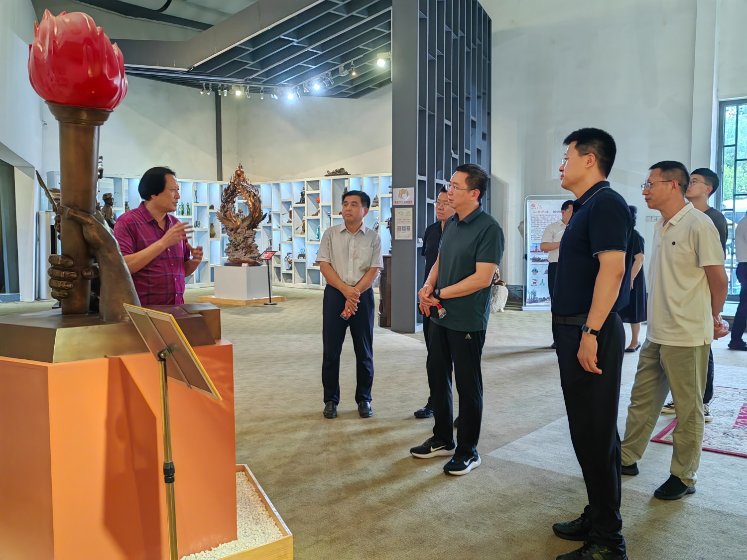 2023年7月19日,山東省財政廳政府債務(wù)管理處副處長李金法,省交通廳交通運輸事務(wù)服務(wù)發(fā)展研究處副處長李國東等領(lǐng)導(dǎo),在臨朐縣委副書記、縣長陳誠陪同下蒞臨華藝雕塑參觀指導(dǎo)。中國工藝美術(shù)大師傅紹相介紹雕塑藝術(shù)。