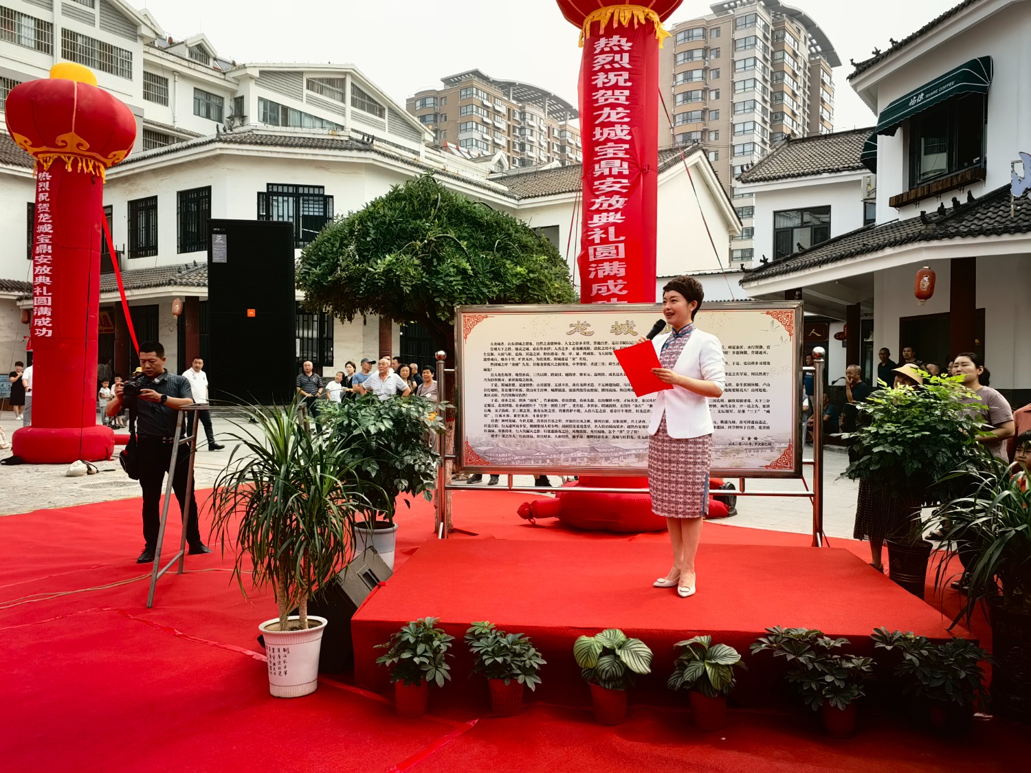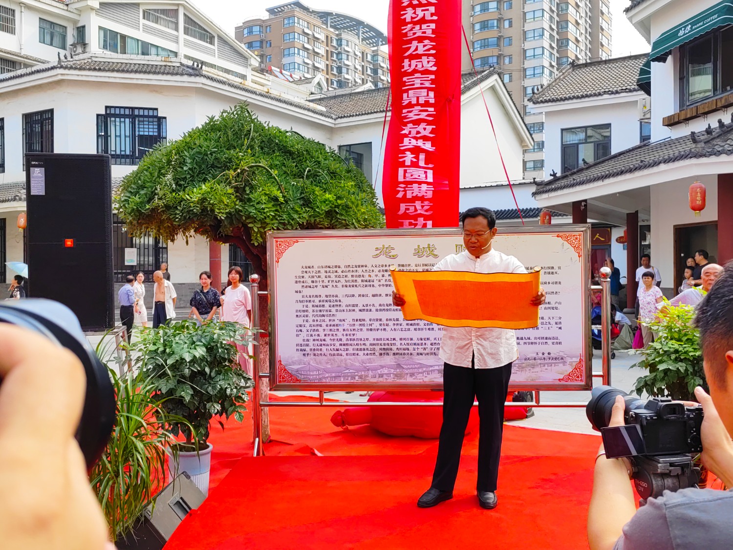 在諸城派古琴演奏家姜燕伴奏下,諸城市融媒體中心播音員趙恩森激情朗誦《龍城賦》全文,王金玲與諸城文旅局負(fù)責(zé)同志為“龍城寶鼎”揭幕。