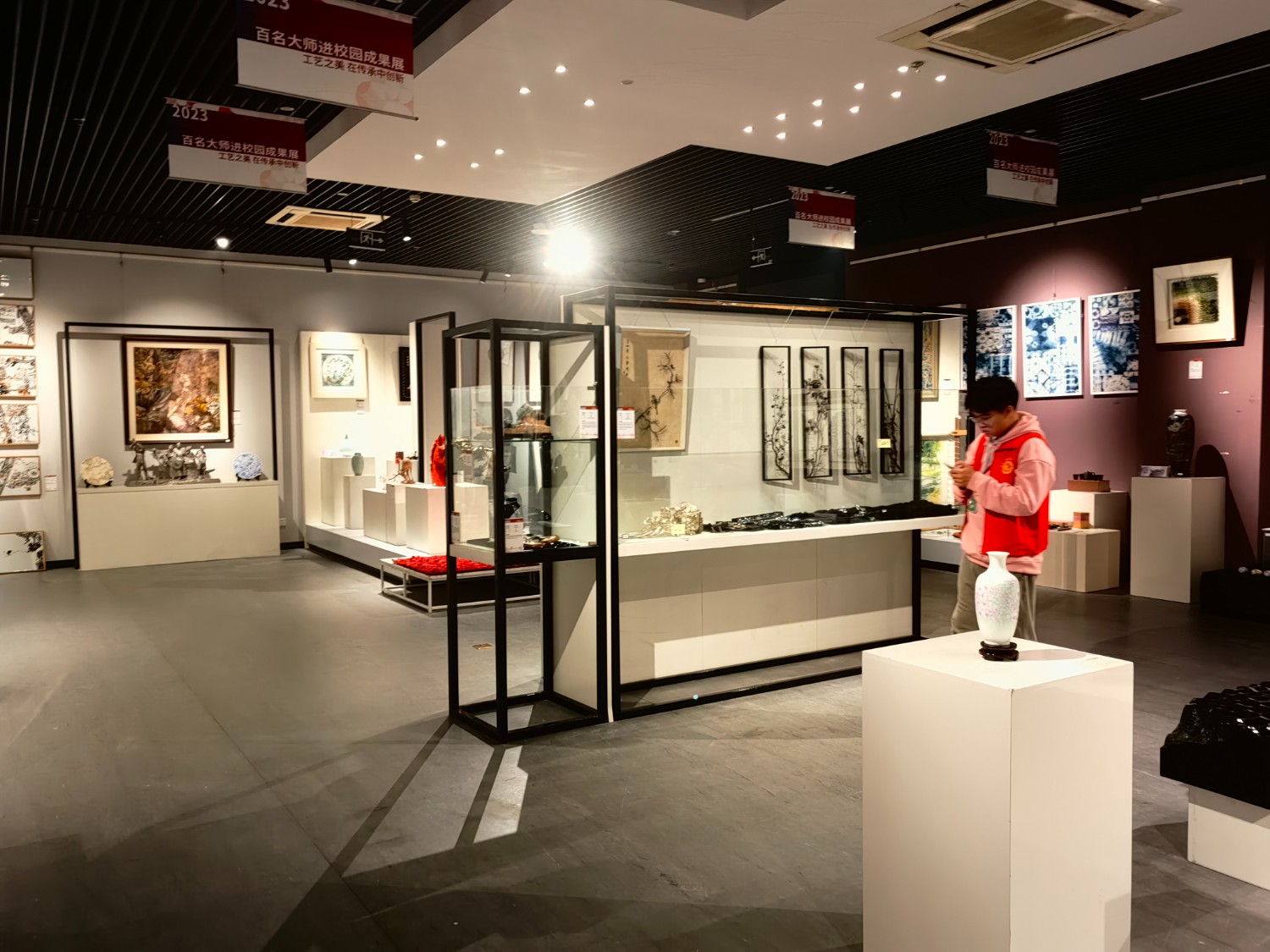 活動中,舉行了工美文創(chuàng)設(shè)計大賽聯(lián)盟學(xué)校授牌儀式,表彰了2022-2023年度中國工藝美術(shù)優(yōu) 秀基地院校和中國工藝美術(shù)優(yōu) 秀校園大師,還為百名大師進(jìn)校園成果展獲獎作品頒獎,并進(jìn)行了新一批大師進(jìn)校園合作協(xié)議簽訂儀式?;顒雍?,與會人員還參觀了百名大師進(jìn)校園成果展。該展覽展出了全國79所基地院校的286件師生作品,涵蓋陶瓷、金屬、雕塑、漆器等9個工藝美術(shù)品類。