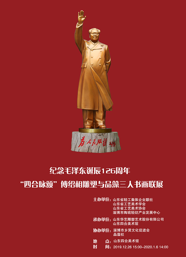 2019年12月26日是毛澤東同志誕辰126周年,為了紀(jì)念一代偉人、緬懷偉人的豐功偉績(jī),由山東省輕工集體企業(yè)聯(lián)社、山東省工藝美術(shù)學(xué)會(huì)、山東省工藝美術(shù)協(xié)會(huì)、淄博市陶琉輕紡產(chǎn)業(yè)發(fā)展中心主辦;山東華藝雕塑藝術(shù)股份有限公司、山東四合美術(shù)館承辦;淄博市鄉(xiāng)賢文化促進(jìn)會(huì)、品藻社協(xié)辦的“四合詠?lái)灐到B相雕塑與品藻社三人書畫聯(lián)展”在美麗的陶琉名城淄博山東四合美術(shù)館成功舉辦。