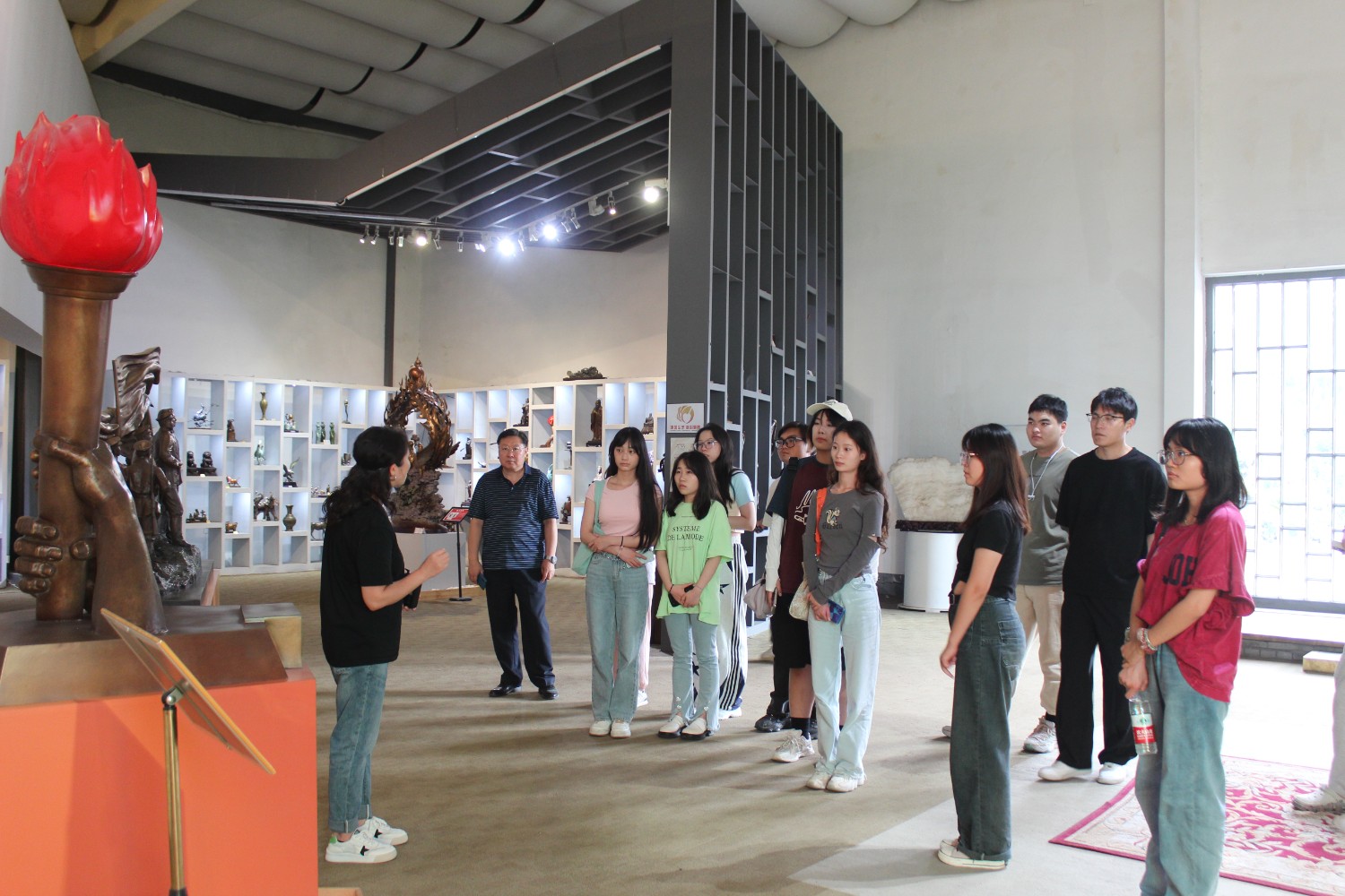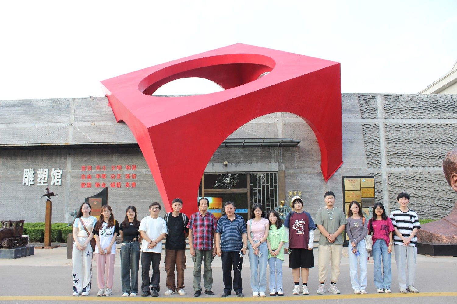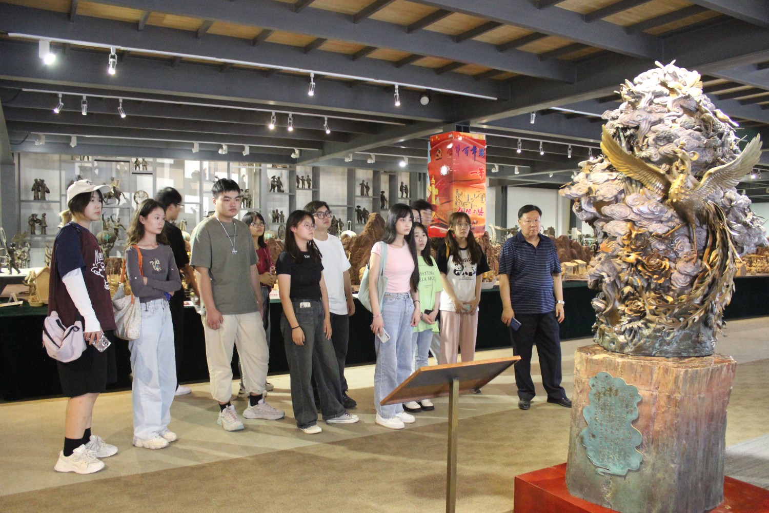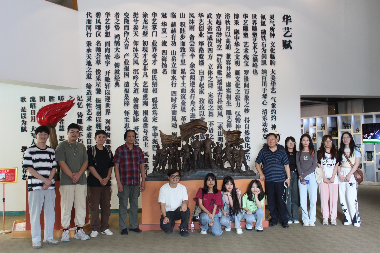 2023年9月13日,山東藝術(shù)學(xué)院教授、碩士研究生導(dǎo)師、工藝美術(shù)學(xué)主任鄭軍先生帶領(lǐng)13位學(xué)生,蒞臨華藝雕塑參觀學(xué)習(xí),中國工美藝術(shù)大師、華藝雕塑董事長傅紹相先生介紹雕塑藝術(shù),并與鄭軍教授和同學(xué)們合影留念。